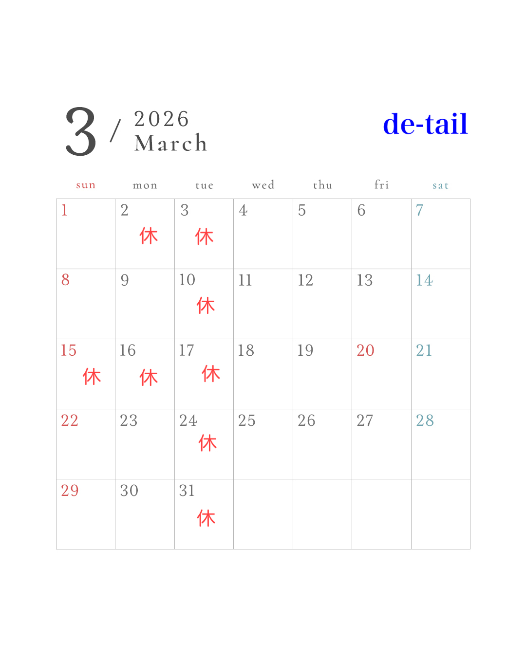 3月の営業日カレンダーになります!