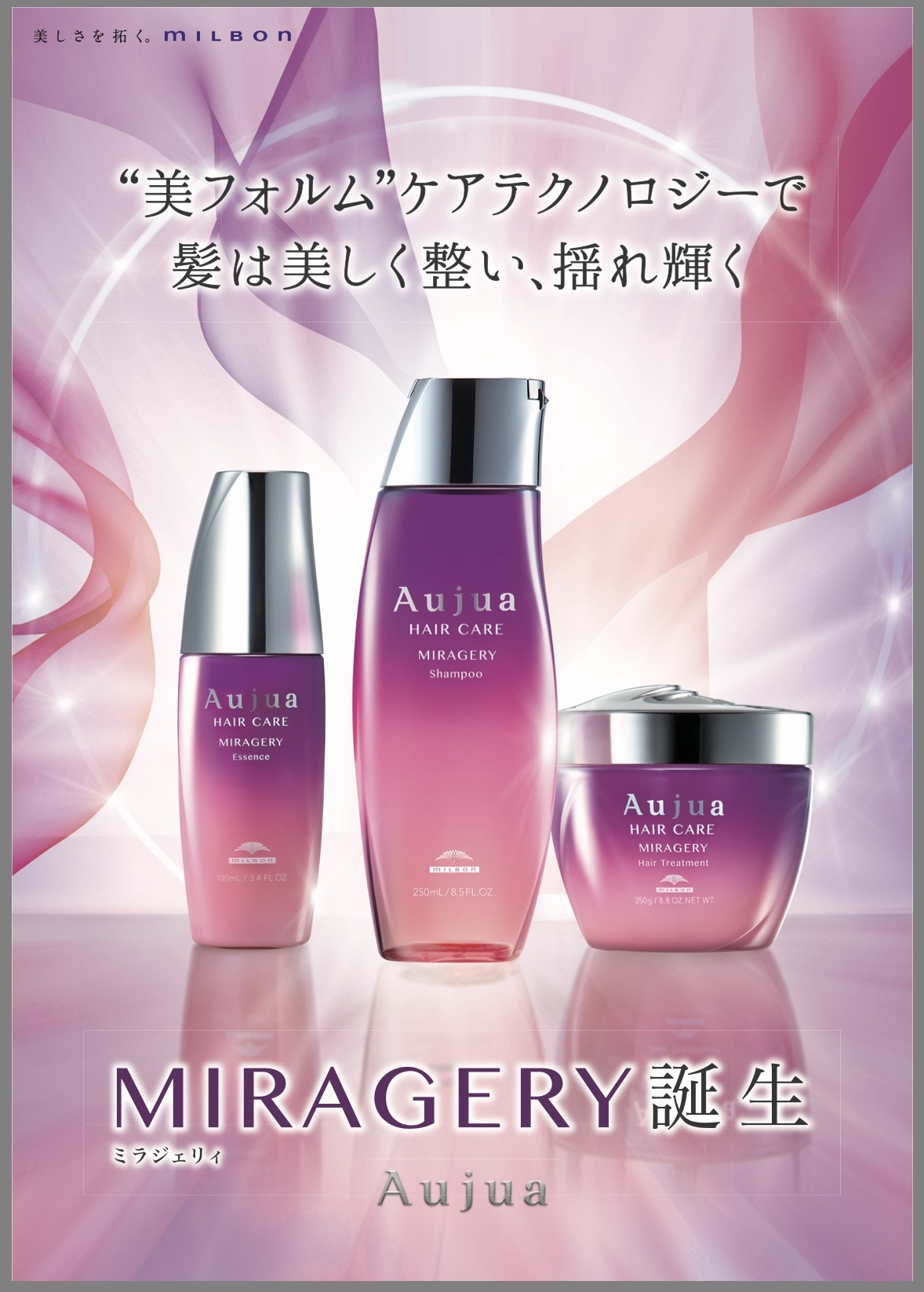 ご好評を頂いておりますAujuaから 新ラインが誕生致しました! MIRAGERY ミラジェリィ です☆ 髪1本1本の形状に内部からアプローチし、 美しいフォルムへ導きます! ↓こんな方におすすめです↓ 髪がじりじり広がりフォルムが乱れ、 ケア効果のもの足りなさが気になりだした方 3種の毛髪補修成分と保湿成分で 手触りよく、軽やかに扱いやすい髪へ整えてくれます! 香りは空木になります! ぜひ、お試しください☆